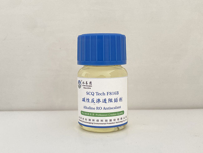 SCQ Tech F816B is an alkaline scale inhibitor designed for reverse osmosis (RO) membrane systems. It inhibits the deposition of inorganic salts, such as calcium sulfate and silicate, on the membrane surface through chelation and dispersion, crystal lattice distortion, and electrostatic repulsion, and it is suitable for high silica and high TDS water conditions, significantly reducing the risk of membrane contamination and extending the cleaning cycle. Its alkaline formula can synergistically deal with heavy metal ions (such as Fe³⁺, Al³⁺) and suspended solids pollution, suitable for industrial wastewater reuse, seawater desalination and other scenarios of the membrane treatment system.