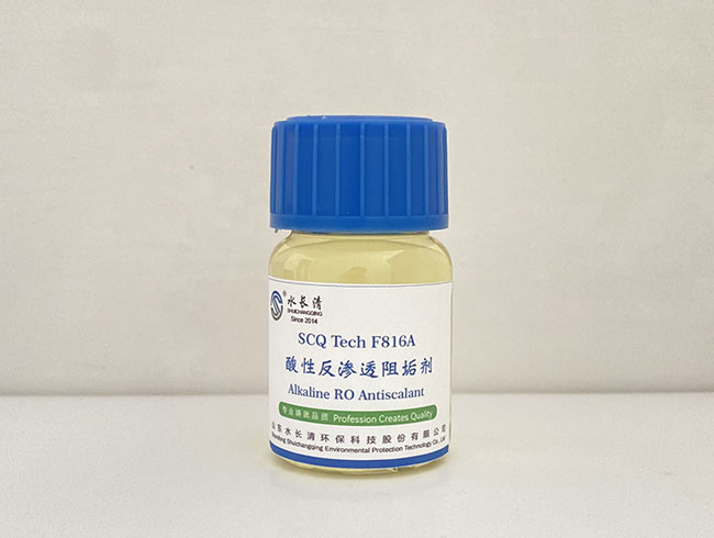 SCQ Tech F816A is an acidic scale inhibitor designed for reverse osmosis (RO) membrane systems. It inhibits the deposition of inorganic salts such as calcium carbonate and calcium sulfate on the membrane surface through complexation , dispersion, and crystal lattice distortion, and it is suitable for high-hardness, high-salinity water environments, which reduces the risk of membrane contamination and prolongs the cleaning cycle. Its acidic formula (PH 2-4) has the functions of both scale inhibition and moderate dissolution of the generated scale layer, which is suitable for the membrane treatment system in the scenarios of seawater desalination, industrial wastewater reuse and so on.